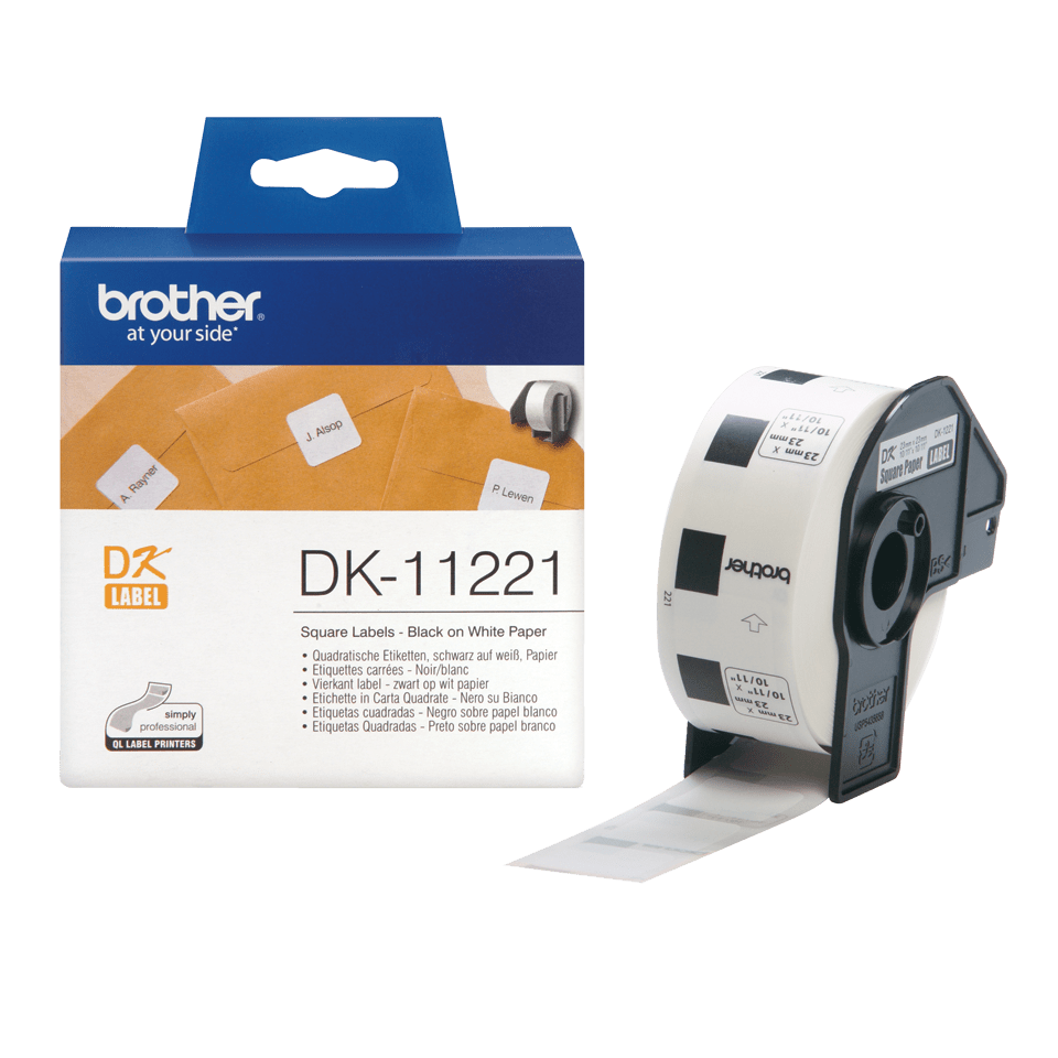 Nhãn in Brother DK-11221 là nhãn cuộn giấy trắng bế sẵn khổ 23mm vuông, thuộc dòng nhãn in Brother DK dùng cho máy in nhãn cuộn Brother QL series. Nhãn DK-11221 được Brother Industries Ltd. sản xuất cho nhãn mã vạch nhỏ, đạt chuẩn EU RoHS, chịu nhiệt và ẩm trong môi trường kho vận, shipping.