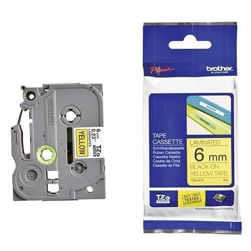 Nhãn in Brother TZe-611 là băng nhãn standard laminated 6mm x 8m chữ đen nền vàng thuộc dòng nhãn in Brother TZe của nhãn in Brother — cảnh báo nhỏ iec 60445 được kỹ sư và kỹ thuật viên chọn cho các ứng dụng đòi hỏi độ bền và tính chính xác cao.