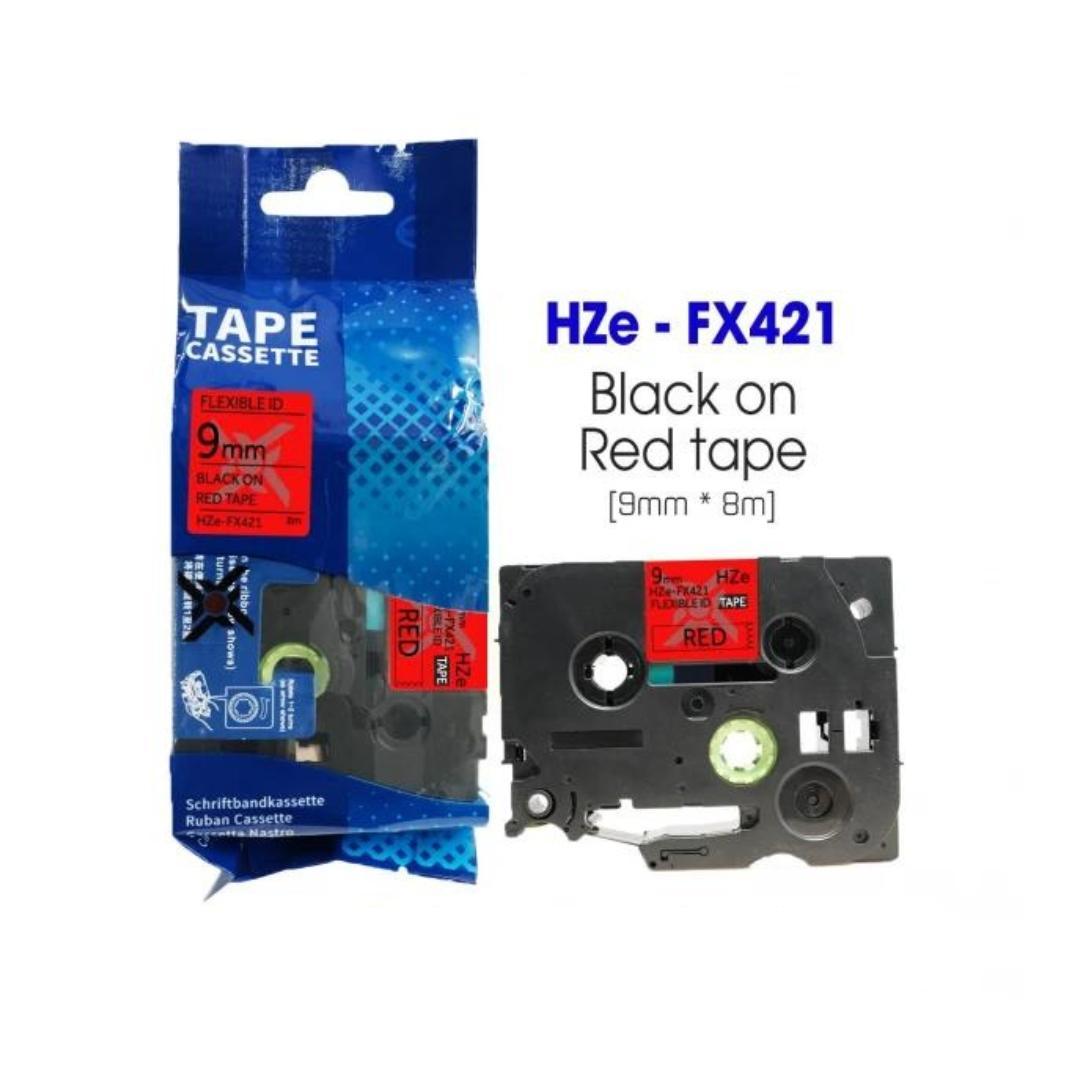 Nhãn in Siêu Dẻo HZe-FX421 | 9mm x 8m | Chữ Đen trên nền Đỏ